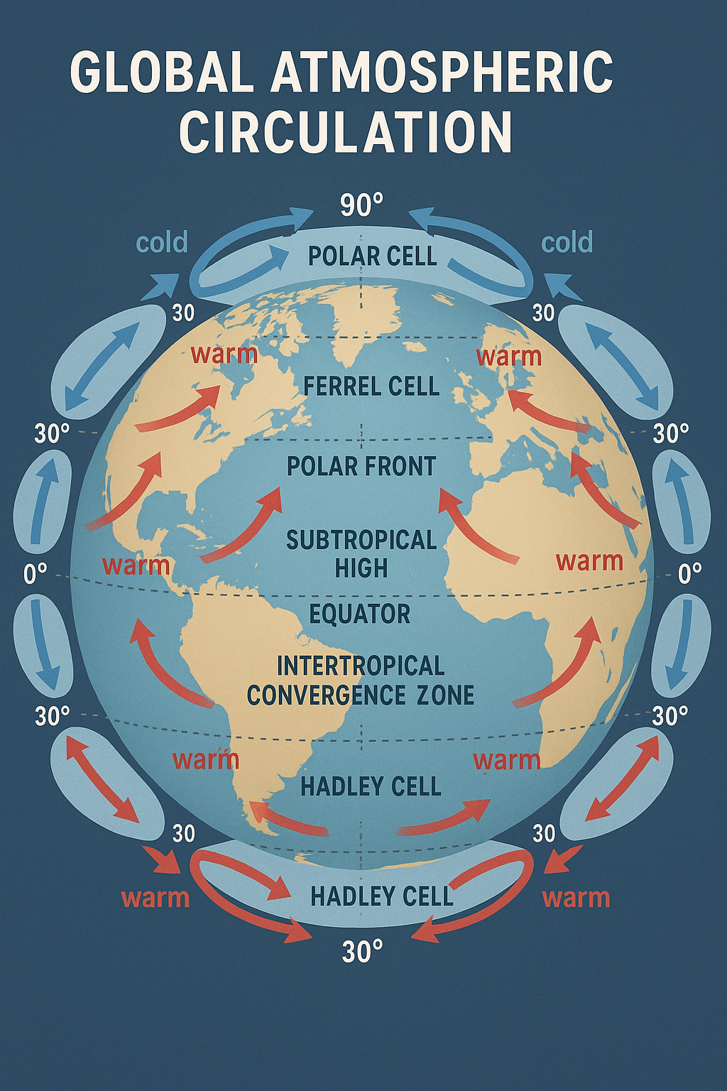 지구의 대기 대순환은 위도에 따라 세 가지 주요 순환 셀로 구분됩니다.
