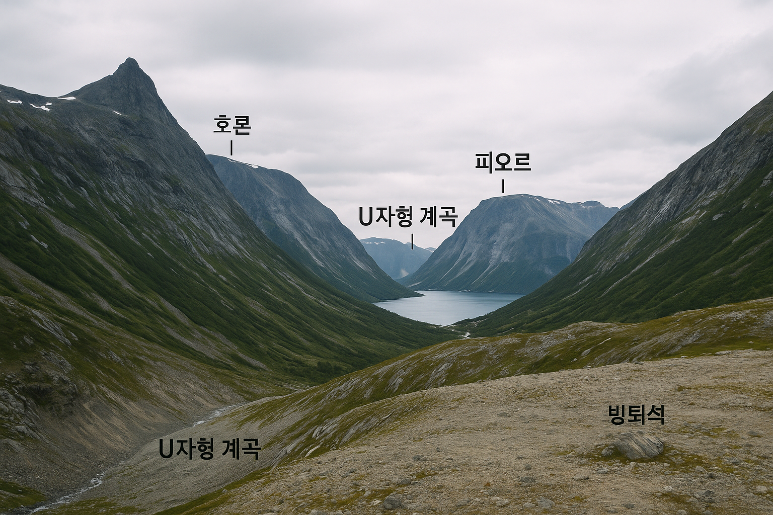 빙하가 운반한 자갈, 모래, 점토 등이 빙하 끝이나 가장자리에 쌓여 형성된 지형입니다. 종퇴석, 측퇴석, 말단퇴석 등 다양한 형태가 있으며, 빙하가 이동한 경로를 보여주는 중요한 단서입니다. - 호른(Horn)과 피오르(Fjord)