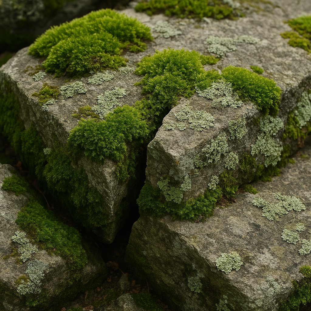 이끼와 지의류는 바위나 벽돌의 미세한 틈에 정착하여 자랍니다. 뿌리는 없지만, 흡착 포자나 균사체로 암석에 단단히 달라붙습니다.