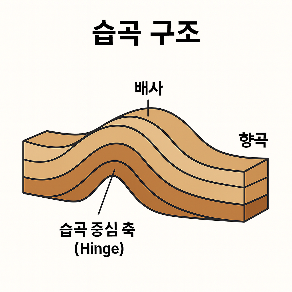 | 향곡(Syncline) | ∪ 모양 | 아래로 오목한 습곡 |