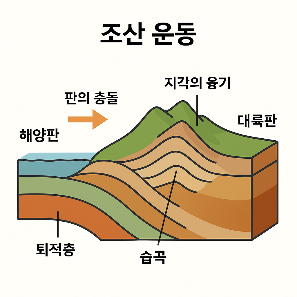 조산 운동은 지각판이 서로 충돌하거나 부딪히는 과정에서 산맥을 형성하는 지각 변형 작용을 말합니다.